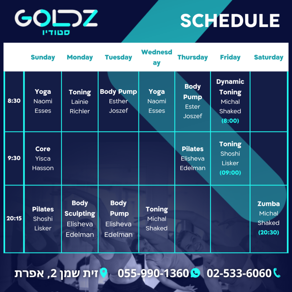 Goldz also offers a modern luxurious women’s studio where you can enjoy Pilates classes, Yoga classes, Zumba classes, and a wide range of other women’s classes. All taught in Efrat by the best and most recommended instructors of Gush Etzion.